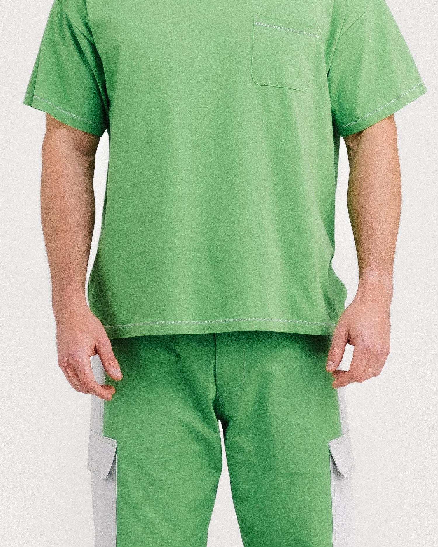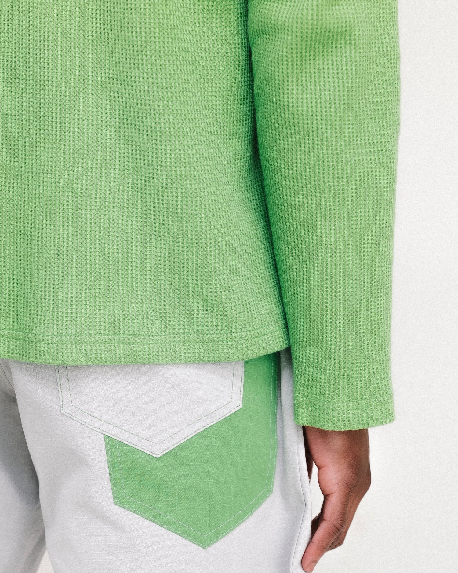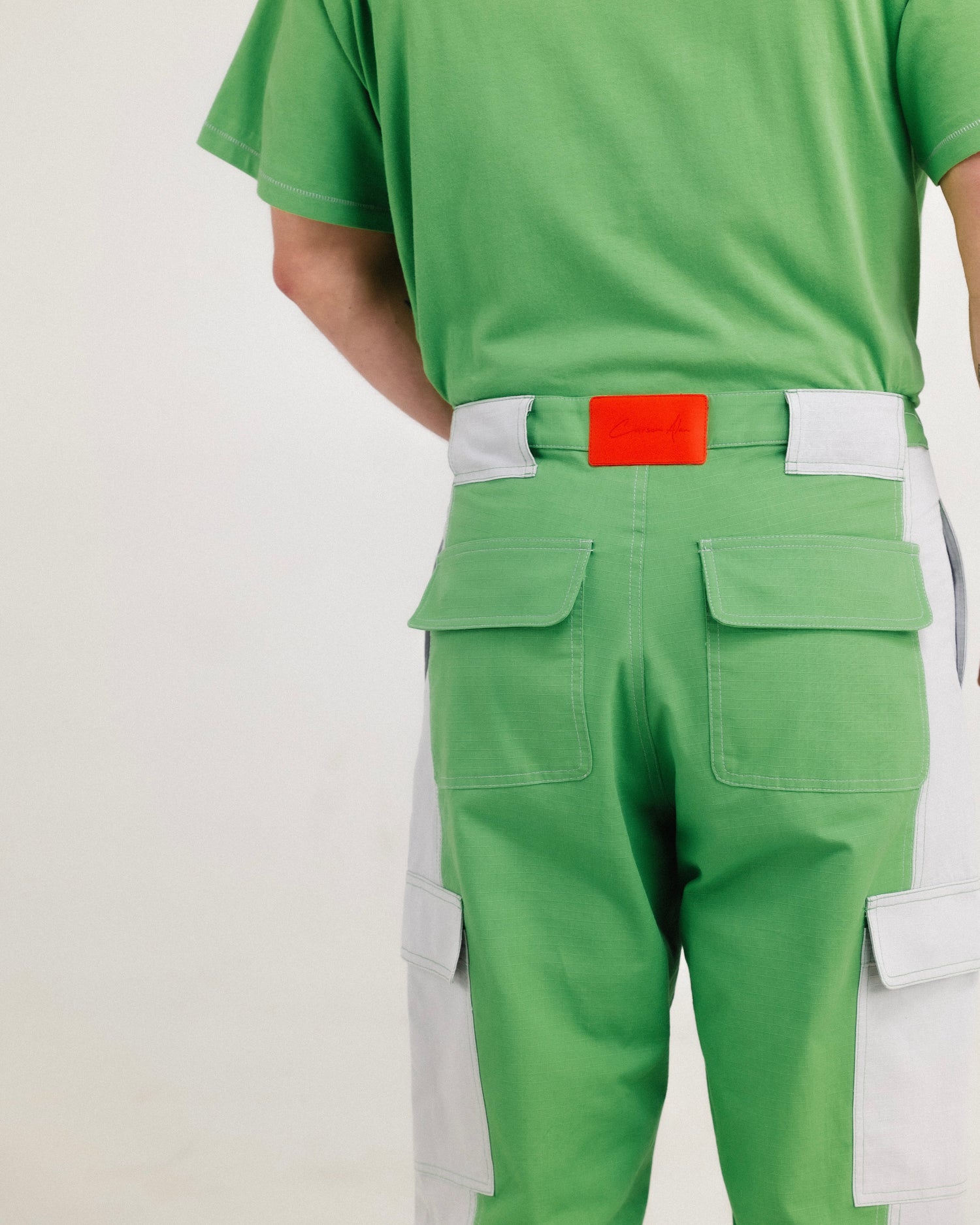 A UTILITY POCKET ON THE LEFT LEG, AND A CONTRAST DOUBLE POCKET ON THE RIGHT LEG.