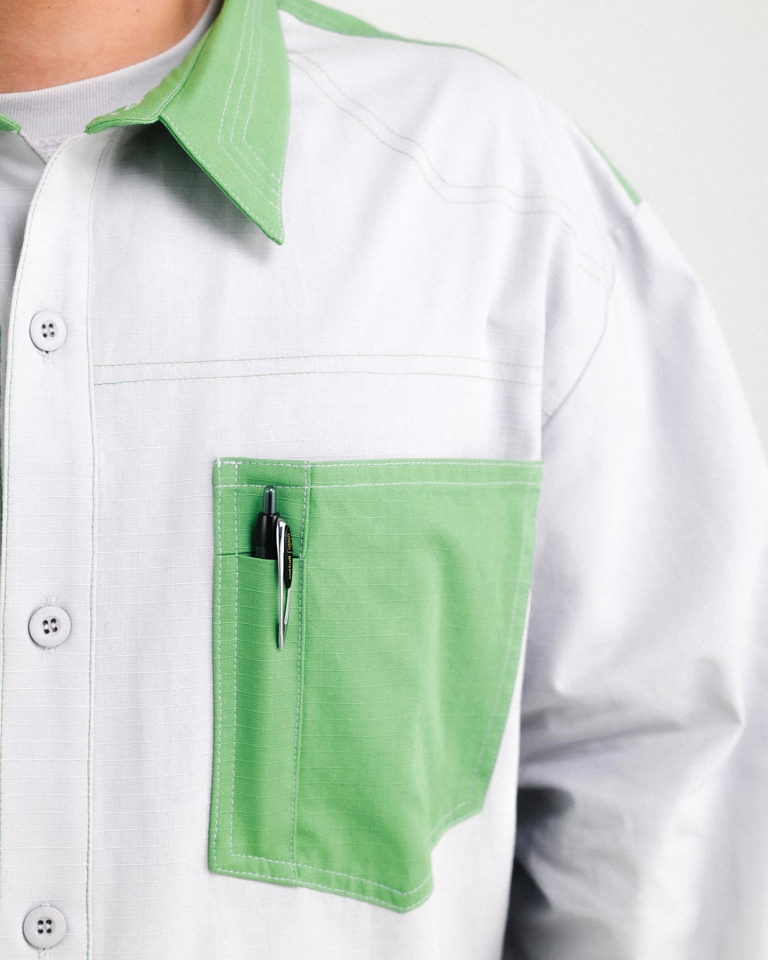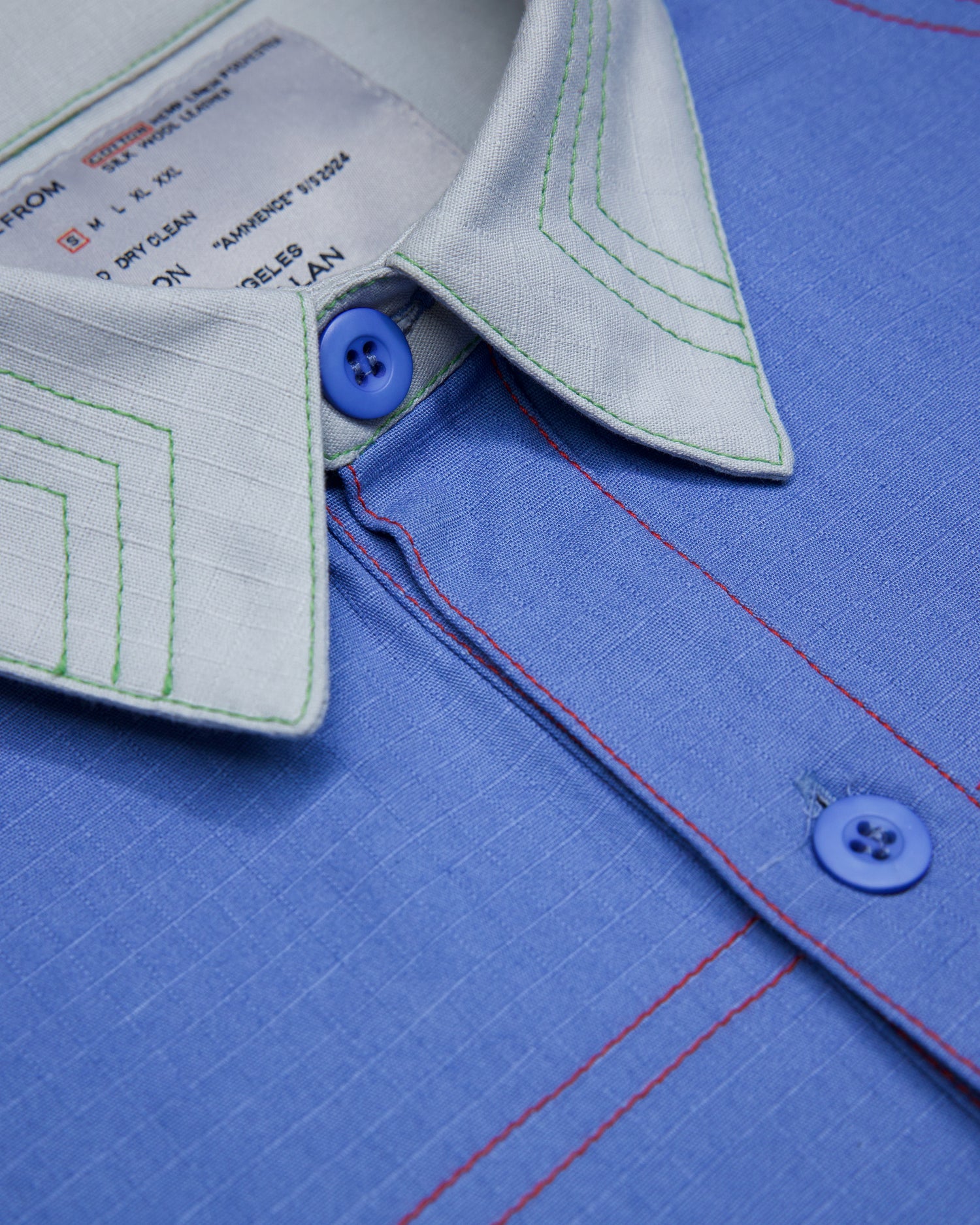 TRIPLE-NEEDLE TOPSTITCH ON THE COLLAR. CONTRAST COLOR TOP-STITCH DETAILS.